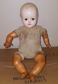 Alrighty, Moon Girl, compose thyself and focus. This week's post is an example of not one but TWO rules that I made for myself and then broke. Firstly, I said that I wasn't into baby dolls and that proved to be a big fat lie. And secondly, I swore that I'd never own a composition doll. This vow stems back to a doll that I saw during one of our family's many antique mall trips. Said doll was about twenty inches and had a lovely face, but she was covered from head to toe in hairline cracks (known among compo lovers as "crazing"). I knew from my doll magazines that this was normal for composition dolls, but I also knew that if not taken care of the crazing would develop into cracks and the doll would start shedding paint. I hated the thought of all that maintenance and promptly swore off composition dolls completely. Then First Uncle gave me two compo babies that his friend's mother had owned (these became my Creepy Babies)...and I bought another large baby on my own free will (Lili Marlene)...and that was the end of that rule. I still don't have a ton of composition dolls since they can be pricey, but I've grown to like the medium. Composition is an odd material, somewhat like a love child between paper and plastic. It's lightweight and it looks, feels, and sounds like high-quality plastic; when tapped with a fingernail it makes a clicking sound, rather than the "clink-clink-clink" of tapped porcelain or the "thump-thump-thump" of vinyl. Composition is also a bizarre combination of sturdy and fragile, meaning that a composition doll won't shatter if dropped like a bisque or resin doll will, but it will chip, crack, and scuff over time. Most importantly, composition absolutely, definitely, positively MUST NOT GET WET, because water makes composition deteriorate faster (this includes humidity in the air). Thus it's fairly easy to find compo dolls that look like this little gal. That particular doll has since been put right as rain, but restoration is a complicated process and can be pricey. It's an expense that may doll collectors are willing to take though, since a good restoration will extend the life of the doll quite a bit.