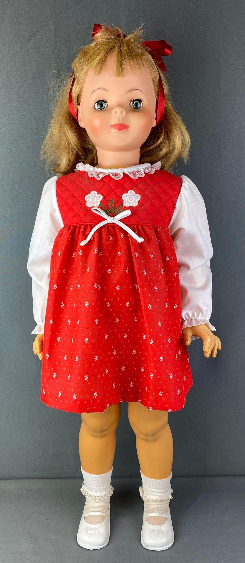 There was a time when I did want one of the Playpal dolls in my collection, but my eye was on Patti's sister Suzy. I still like Suzy Playpal and won't turn my nose up at her if I ever find one, but for now Sandy fills the big doll void just fine. I have to confess that there's a bit of a learning curve when owning one of these larger dolls. They've got longer arms and legs, and as such they're...kinda like dressing a real child, minus the wiggling. I also have fears about Sandy being fragile, but I also have this concern about Kissy, Crissy and company, and Chatty Cathy. Basically if they're vintage and bigger than a Barbie, I'm afraid of breaking them. That said, Sandy has a commanding presence in my collection due to his size, and for me in particular he's special because he's a gift. So if you can find one of these big boys for a reasonable price, get him, and if some lovely friend drops one on your doorstep, keep him! They're few and far between on eBay, and the prices when they DO turn up are insane! I'm therefore blessed to have this big boy by my side, and equally blessed to have a friend like Donna.