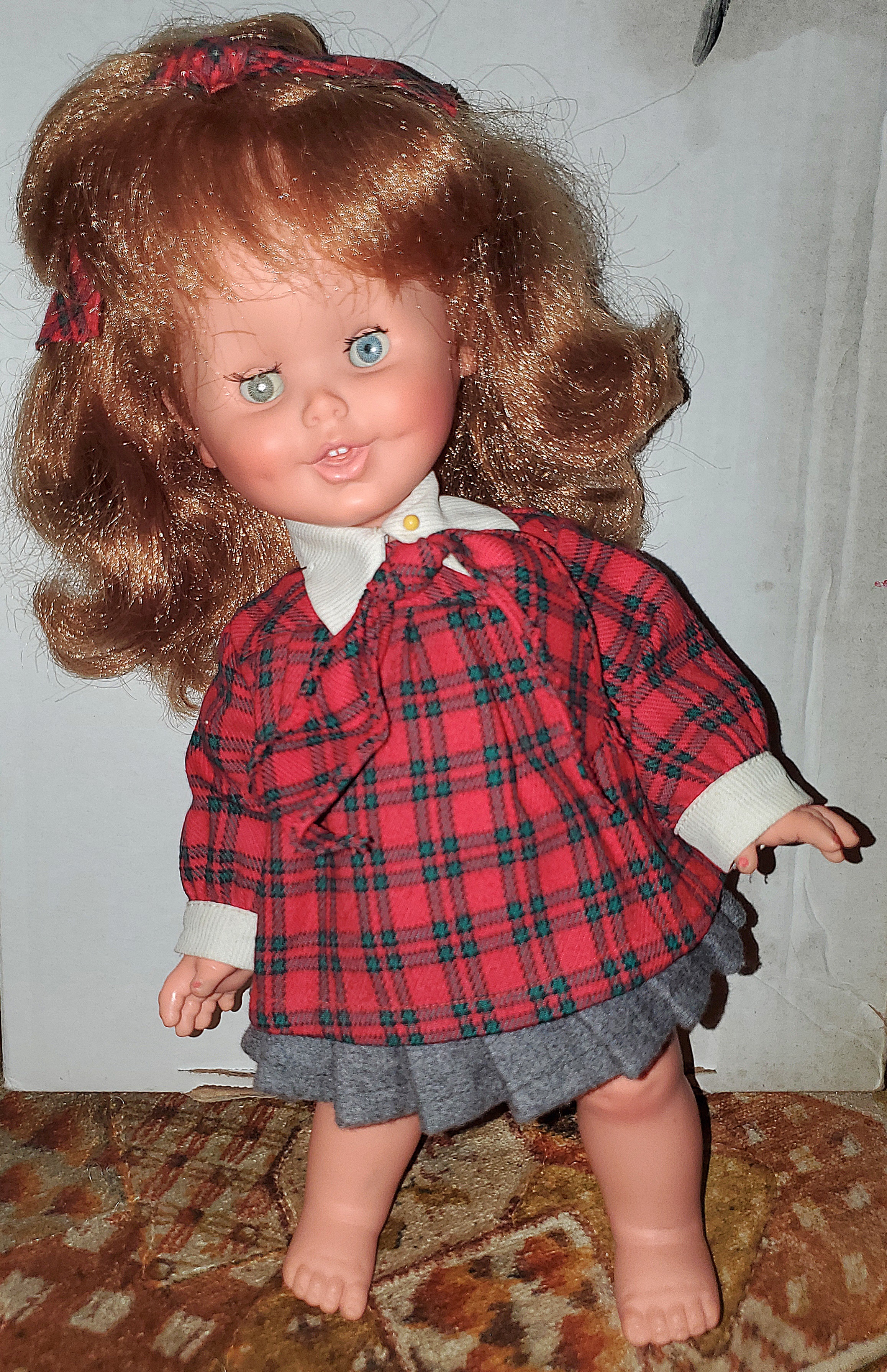 The lost doll's name was Anita, and she would have looked like this but in rougher shape.  If I ever go looking for an Anita again I'll look for one in better condition.  I don't know what the new girl's name is, but she's a character!  I've yet to find another Furga doll with this exact face, by the way.  I've found 'em with similar head molds, but not this exact one.